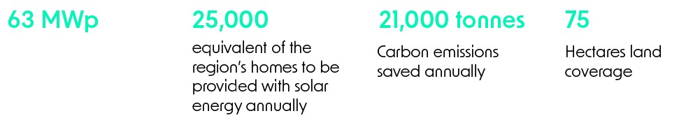With a DC capacity of 63MWp, plus the potential for a 50MW BESS, the facility will generate enough power for the equivalent of approximately 25,000 homes, whilst saving around 21,000 tonnes per year of CO₂.