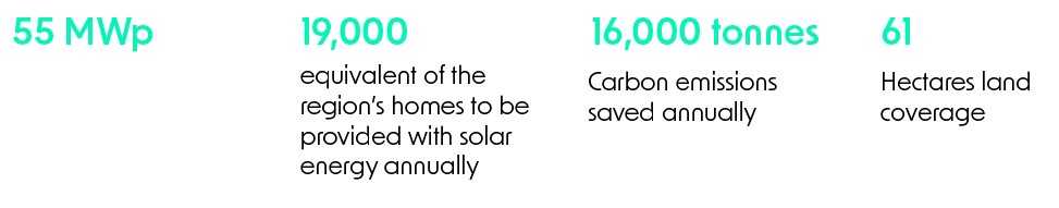 With a DC capacity of 55 MWp, plus the potential for a 18MW BESS, the facility will generate enough power for the equivalent of approximately 19,000 homes, whilst saving around 16,000 tonnes per year of CO₂.